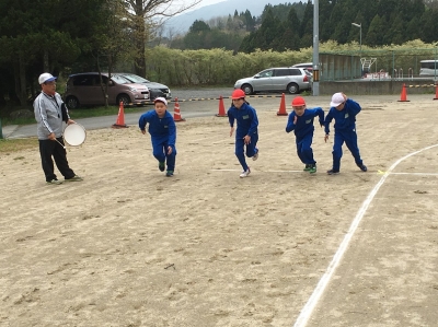 上学年リレー練習、スタートの様子です。「さあ、いくぞ~。」