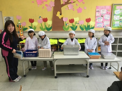 1年生だって自分たちで準備します。先生に教えてもらいながら、エプロンを着て、食缶を準備して、配膳しました。