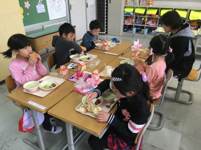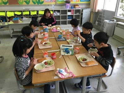 今日の献立は、コッペパン、牛乳、アスパラクリームシチュー、キャベツとハムのサラダ、いちご、リンゴジャムでした。1年生の子供たちに感想を聞いてみたところ、みんな「おいしかった。」と答えてくれました。野菜が苦手な子もいたようですが、少しずつ食べられるようになるといいなあ。