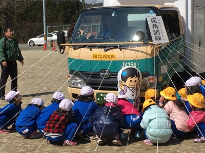 一つ目は、トラックには「死角」という運転手には見えにくいところがあること。実際に、子供たちが死角となるところに隠れ、運転手から見えないことを体験しました。