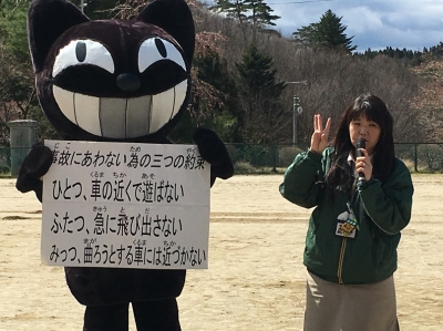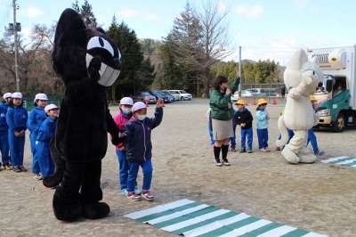 四つ目は、横断歩道の渡り方について。このとき、クロネコ君とシロネコちゃんが登場し、子供たちと一緒に横断歩道を渡ってくれました。