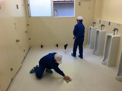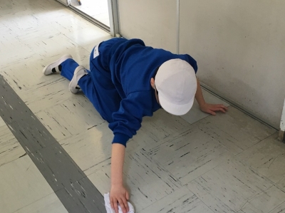 1年生だって負けてはいません。上級生に拭き掃除の仕方を教えてもらいながら、隣に並んで一緒に頑張っていました。