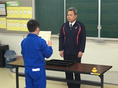 家庭の交通安全推進員は6年生全員に委嘱されました。代表児童が委嘱状を受け取り、交通安全に向けた家庭の推進役として取り組むことを約束しました。