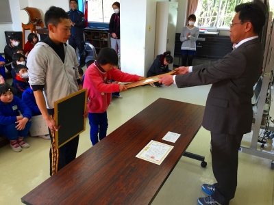 表彰では、福島県小学生陸上競技10傑と小野町文化・体育振興基金条例に基づく表彰、漢検の満点賞、紙コップ桂剥きの記録賞の伝達がありました。