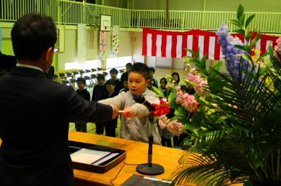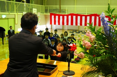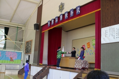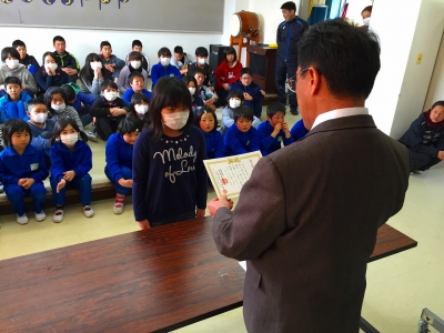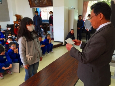本日、修了式があり、校長先生から代表児童が修了証書をいただきました。