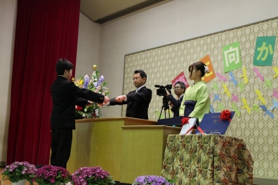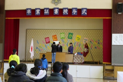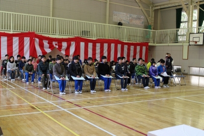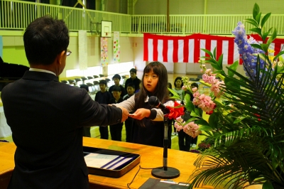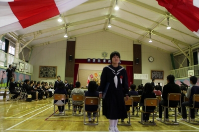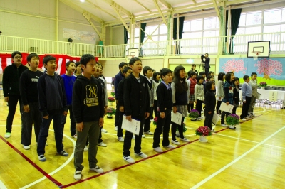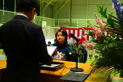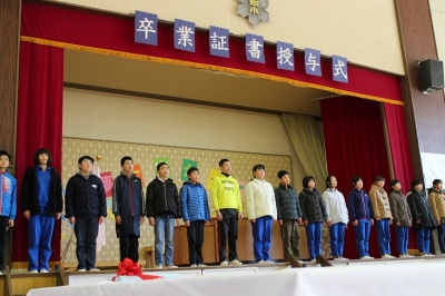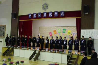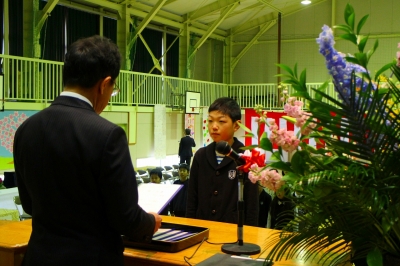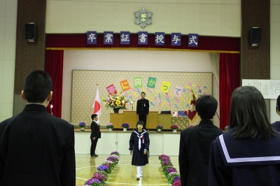 卒業証書授与、校長や教育委員会、来賓の方からのはなむけの言葉、卒業記念品授与と進み、別れの言葉になりました。