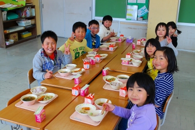 みんな大好物のエビフライは、最初に食べる派と最後のお楽しみにとっておく派に分かれていました。今年度最後の給食、よく味わって食べていました。