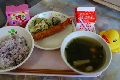 メニューは、ゆかりごはんに牛乳、すまし汁、エビフライ、ツナサラダ、イチゴケーキでした。