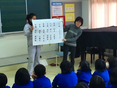 まず「お経」(阪田寛夫・作)という詩をみんなで楽しく読みました。プリントを持ち帰ったのでお家でも唱えてみてください(仏壇の前ではダメですよ)。