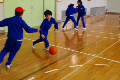 ペアになって、いろいろなドリブルに挑戦した後、しっぽとり+ドリブルゲームをしました。(しっぽをつけた人がドリブルをして、しっぽを取られたら負けというゲームです。)