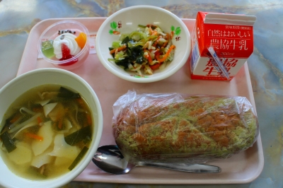 今日の桃の節句。給食は「ひなまつり・お楽しみ献立」でした。みんなが大好きな揚げパンにワンタンスープ、海そうサラダ、いちごのアラモードでした。