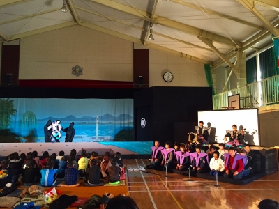 幕が張られ、本格的なセットもあり、体育館が芝居小屋に大変身していて、子どもたちは少し緊張気味でしたが、まるで生きているかのような人形の動きを見てとても驚いていました。