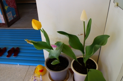 ボランティア委員会で育てていたチューリップがきれいな花を咲かせました。