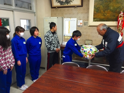 2016年3月7日 16時52分 本日、本校で1年間集めたエコキャップを早川新聞店さんにお渡ししました。