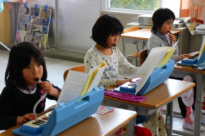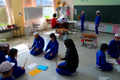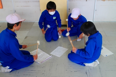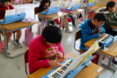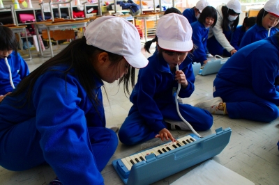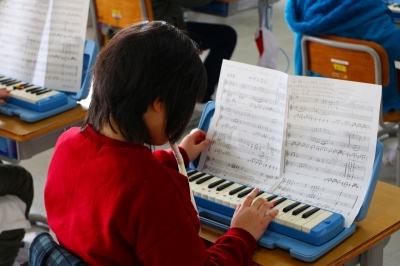 鍵盤ハーモニカを卒業する4年生は、5・6年生に教えてもらいながら、初めてふれる楽器の練習に一生懸命取り組んでいます。