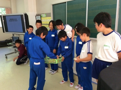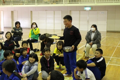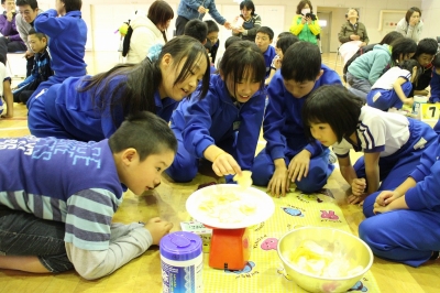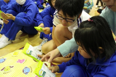体育館に集まると、縦割り班の10グループに分かれて、ポテトチップスの量を実際に測ったり、クイズに挑戦したりしました。ある“教科書”をつかって賞味期限と消費期限の違いや、栄養成分表示についても学びました。(“教科書”、おいしくいただいたでしょうか...??)