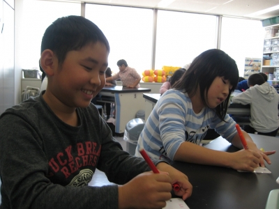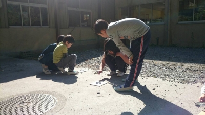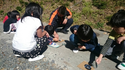 写真は、虫眼鏡を上下させ、太陽の光を集めているところです。紙を焦がすことができることが分かりました。安全面の指導もしながら学習を進めています。
