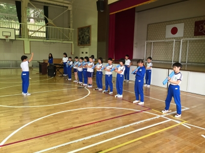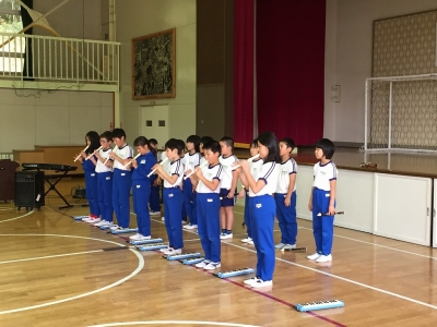 2015年10月21日 13時45分 飯豊っ子タイムに、町音楽祭に向けての激励会が行われました。校長先生と代表委員の児童からの励ましの言葉の後に、3・4年生が息のそろった演奏を聴かせてくれました。夏休みからコツコツと練習を重ねてきた3・4年生。本番の演奏も楽しみです。