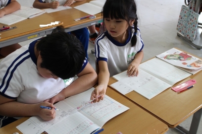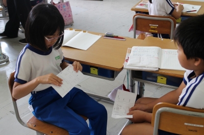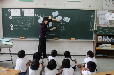 2年生の算数、「ひっ算のしかたを考えよう」という単元で、「102-65」といった十のくらいからくり下げられない時の計算は、どうすればよいのかみんなで考えました。一人一人で考えた後、全体やペアで発表したりしながら、理解を深めていたようです。