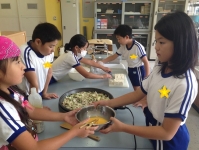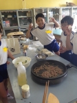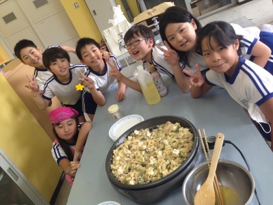 わたをくりぬいたり、塩もみしたゴーヤを水ですすいだり、卵をといたり、豆腐を切ったりと、積極的に動く子どもたち。「先生、こうするんですよ!」とアドバイスをされる場面も。作ったことがないので、とてもありがたかったです。