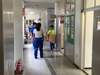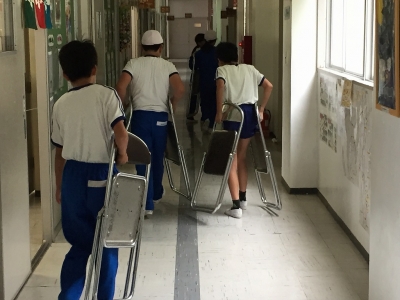 その後、6年生にも手伝ってもらい、体育館に保管していた運動会用の長机やイスを移動しました。