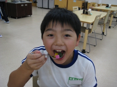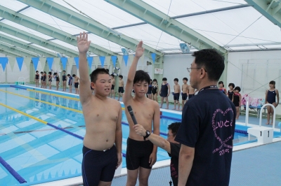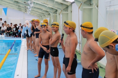 1~3年生の25mビート板をはじめ、各学年毎に25m自由形、平泳ぎ、背泳ぎ、50m自由形を行いました。記録会の終わりには、6年生に自由形、平泳ぎ、バタフライの模範も披露してもらいました。