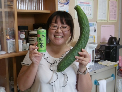 本日午前11時30分頃、大きな大きなおばけキュウリが収穫されました。あまりにも大きいので、みんなで「うんとこしょ、どっこいしょ。」と一生懸命引っ張り・・・って、それは「おおきなかぶ」! 実際ははさみでチョッキン、片手でひょいと持てました。