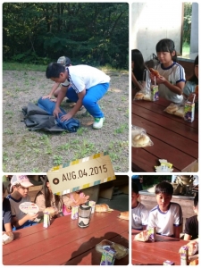1日のスタートは、テントの片付けから。朝食は、パンをいただきました。