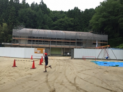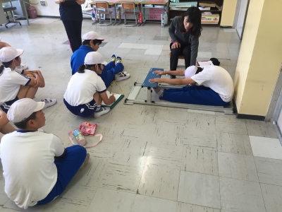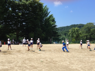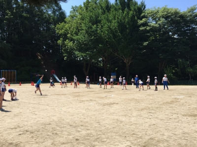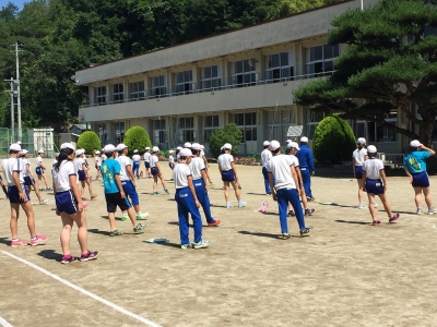 はじめに校庭で、ストレッチ等の準備運動をした後、数グループに分かれて、50m走、立ち幅跳び、ソフトボール投げ、長座体前屈に取り組みました。気温が高かったため、熱中症に気をつけ、水分補給をしながら行いました。