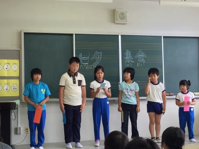 今日は七夕です。3校時目に七夕集会があり、代表委員から織り姫と彦星にまつわるお話、校長先生から「棚機」のお話がありました。その後、代表児童は願いごとを発表しました。