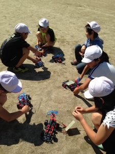 子どもたちは次々と「モーターが回ってます!」「太陽に向けると早く回ります!」など、気づいたことを交流していました。また、太陽光を鏡で集めるほどに速くなるモーターの動きに気づくことができました。