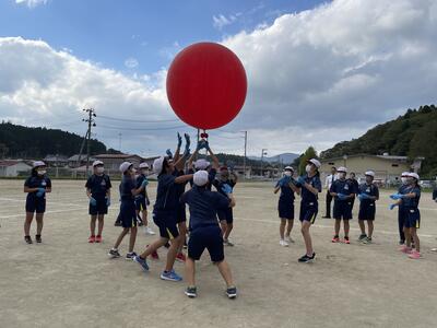 2年生2人、5年生2人で4人グループを作り、だるまを落とさないように運びます。