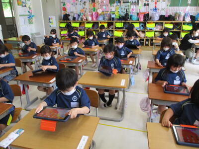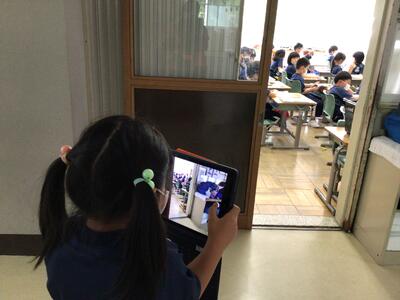 次の日、プール帰りの目に飛び込んできたのは、タブレットで写真を撮る2年生。