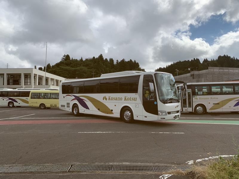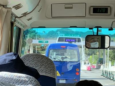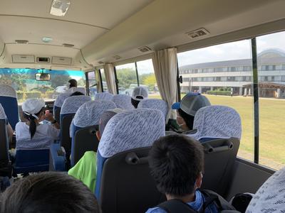 1クラス1台のバスに分乗し、出発します。バス、12台。