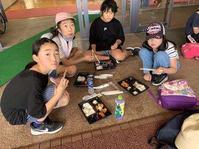 昼食の時間になりました。から揚げ弁当をいただいています。