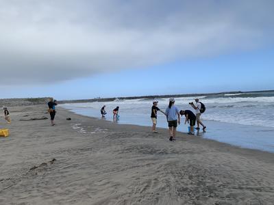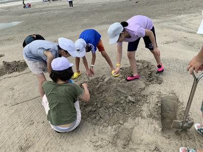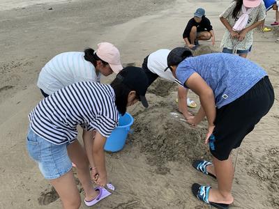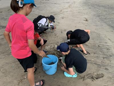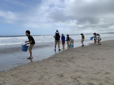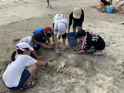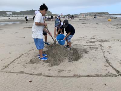 2020年9月3日 15時00分四倉海岸で,班ごとに「砂」で作品づくりをしています。天気は曇りで,風もあり活動に最適です。