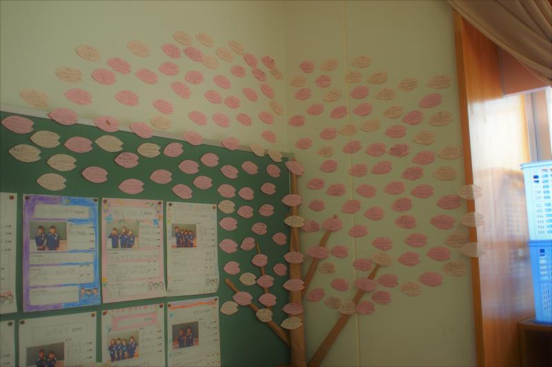 【クラスの後ろの掲示板に、友だちのよいところを書いた花びらを貼っています】