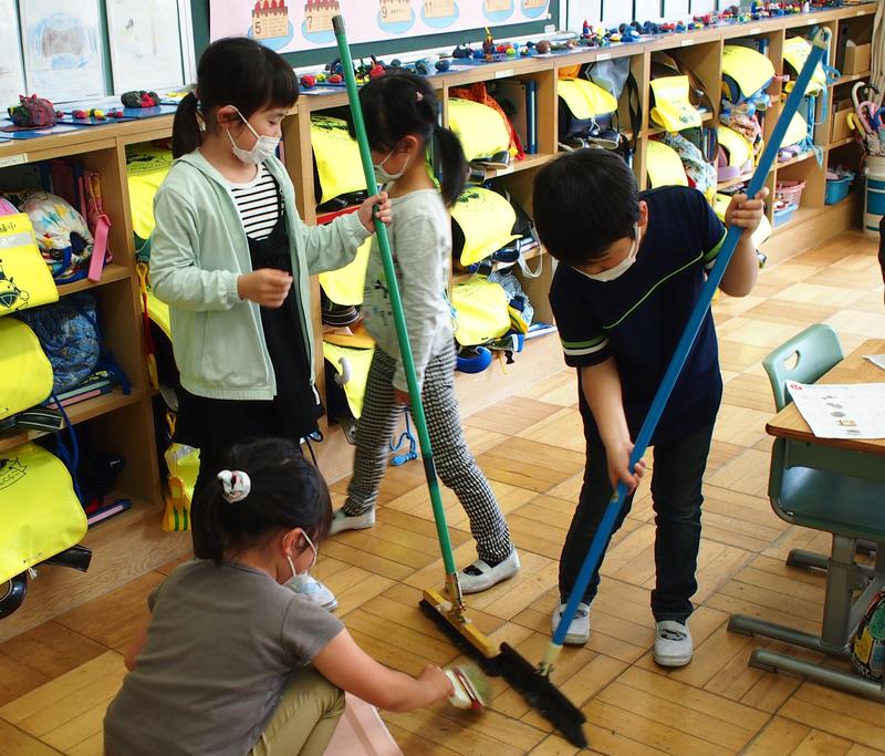【お掃除がなかった日に、1年生が自分の教室をきれいにしています】