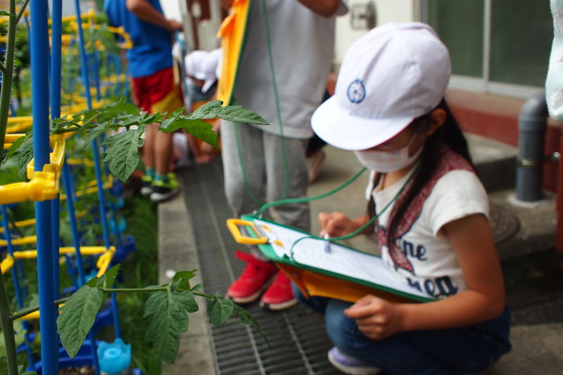 子どもたちは、葉や実の大きさを測ったり、きゅうりのトゲトゲにびっくりしたり、新たな発見をしています。