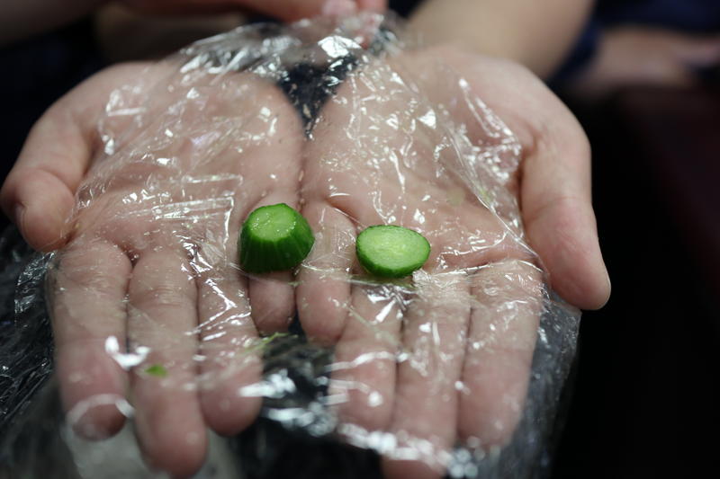 小さいキュウリですが、試食をしたそうです。みんなは、この大きさで一切れずつ食べたそうですが、私はなんと二切れもいただいてしまいました。