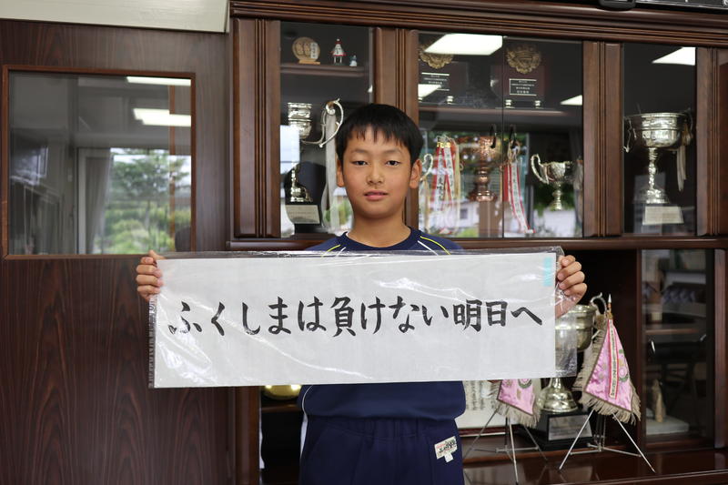 本校の6年生の長久保育男くんの書いた「ふくしまは負けない 明日へ」という字が福島民報の特集記事の題字として使われました。また、育男くんへの紹介も顔写真入りで掲載されました。