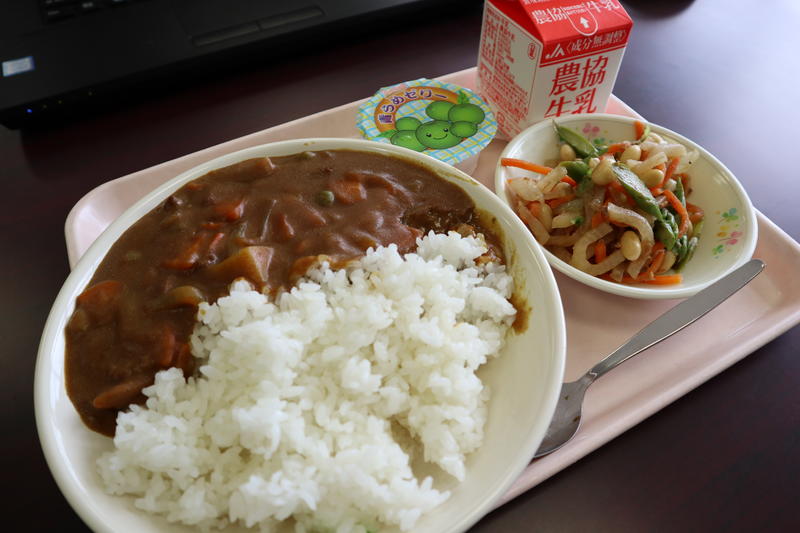 今日のメニューは、ビーフカレー、ガーリックサラダ、青うめゼリーです。