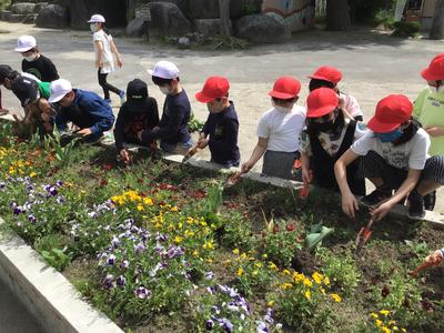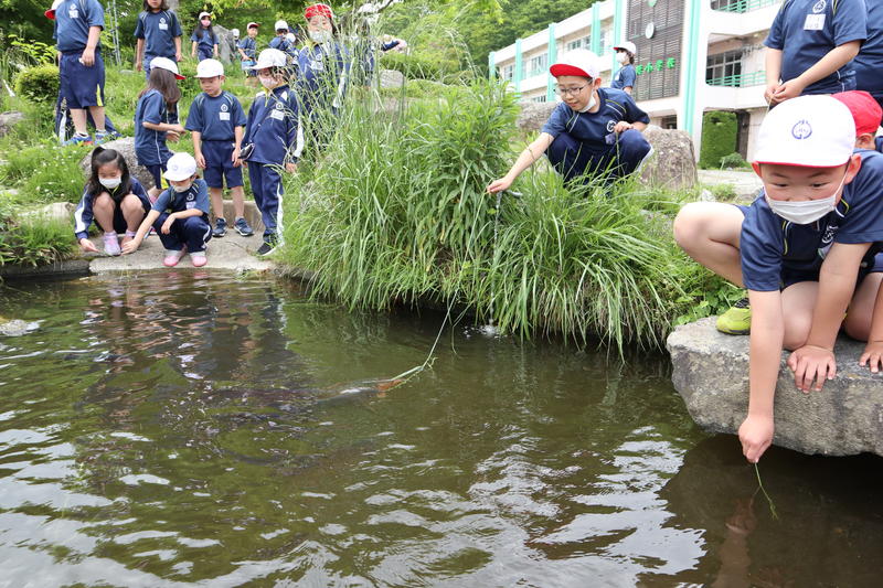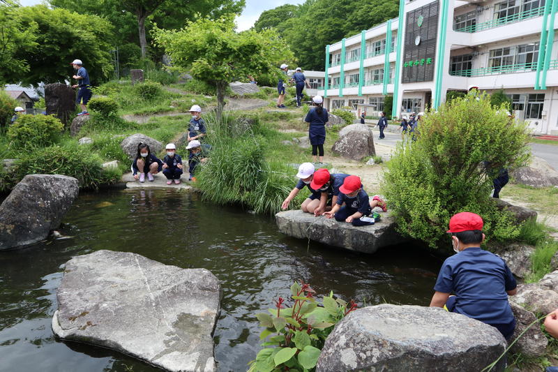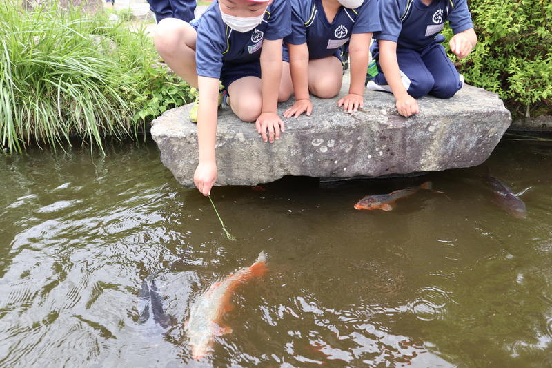 池には、大きな鯉がたくさんいます。人に慣れていて、草やごみ、そして、人の指も口でくわえようとします。ですから、子どもたちは水面に指をつっこんだり、草を入れたりするのですが、その時に自分の体まで「ドボン!」ということが、たまにあります。