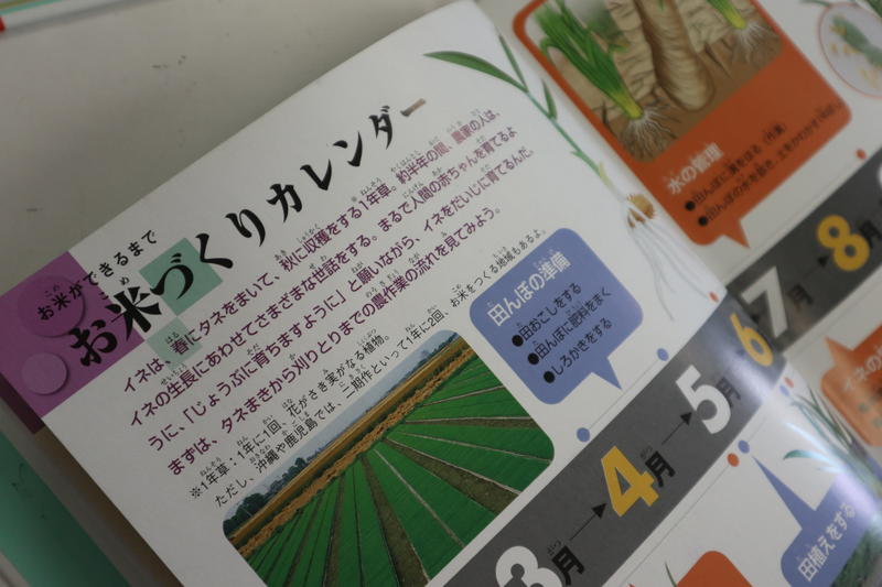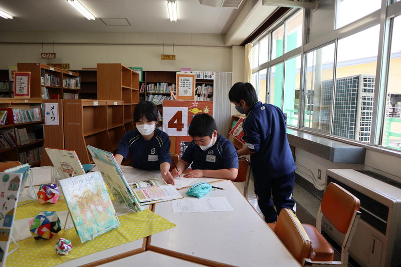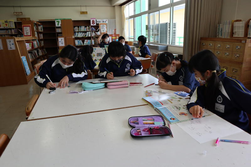 5年3組が図書室で、5年2組がコンピューター室で田植えについて調べていました。