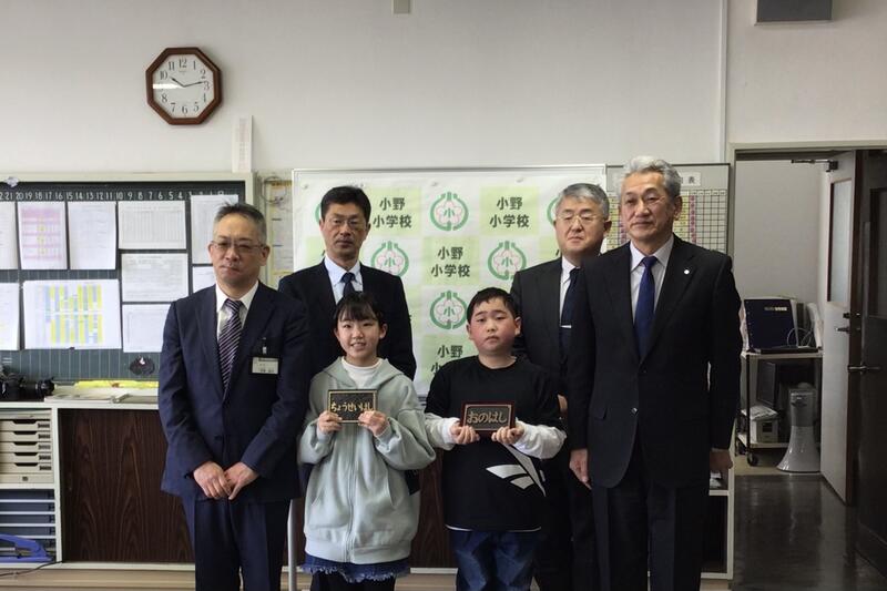 小野町を流れるの右支夏井川の橋の欄干にある橋名を書いた児童2名に、レプリカの橋名板が贈呈されました。
