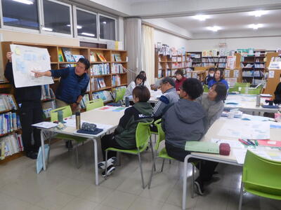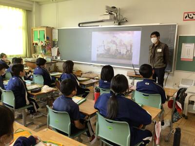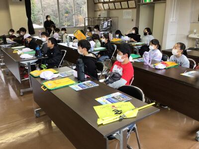 まず、教室で、森林の役割や現状などについて教えていただき、森林が自分たちの生活と様々な形で関わっていることを学びました。
