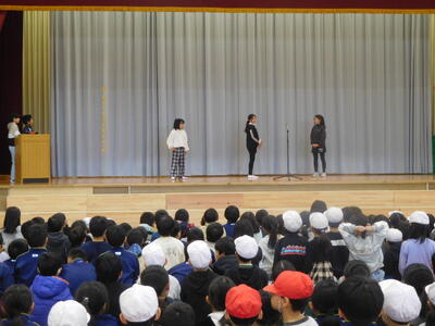 本日は、県小学校理科作品展の入選2名と空手道選抜大会東北地区予選会女子形1年の部で1位の子どもを表彰しました。