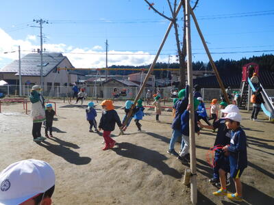 前夜の雨で遊具の回りには水たまりが残っていましたが、こども園の子どもたちは、気にすることなく楽しそうに遊んでいました。