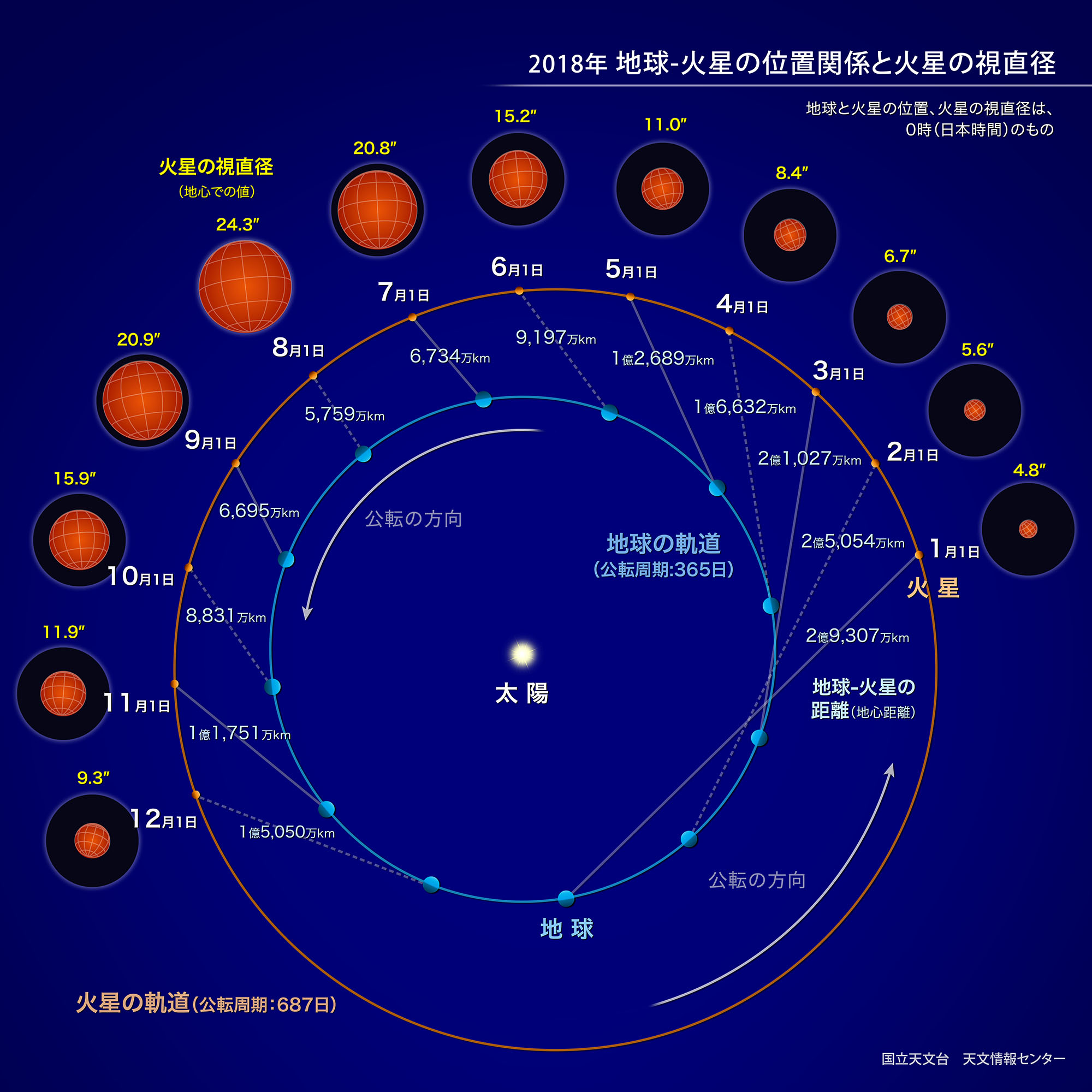 起こるいわゆる「大接近」です。右の図は、2018年の地球と火星の位置を表したものです。1月1日には地球と火星は3億キロメートル近く離れており、火星の視直径は5秒角もありません。その後、地球が火星に近づくにつれて火星の視直径がしだいに大きくなっていきます。そして、7月31日16時50分に、地球と火星は、5,759万キロメートルの距離まで接近します。このとき火星の視直径は24秒角を超え(月の視直径の約77分の1)、明るさはマイナス2.8等と、木星よりも明るくなります。ただし、最接近の時刻では、日本では火星はまだ空にのぼってきていません。