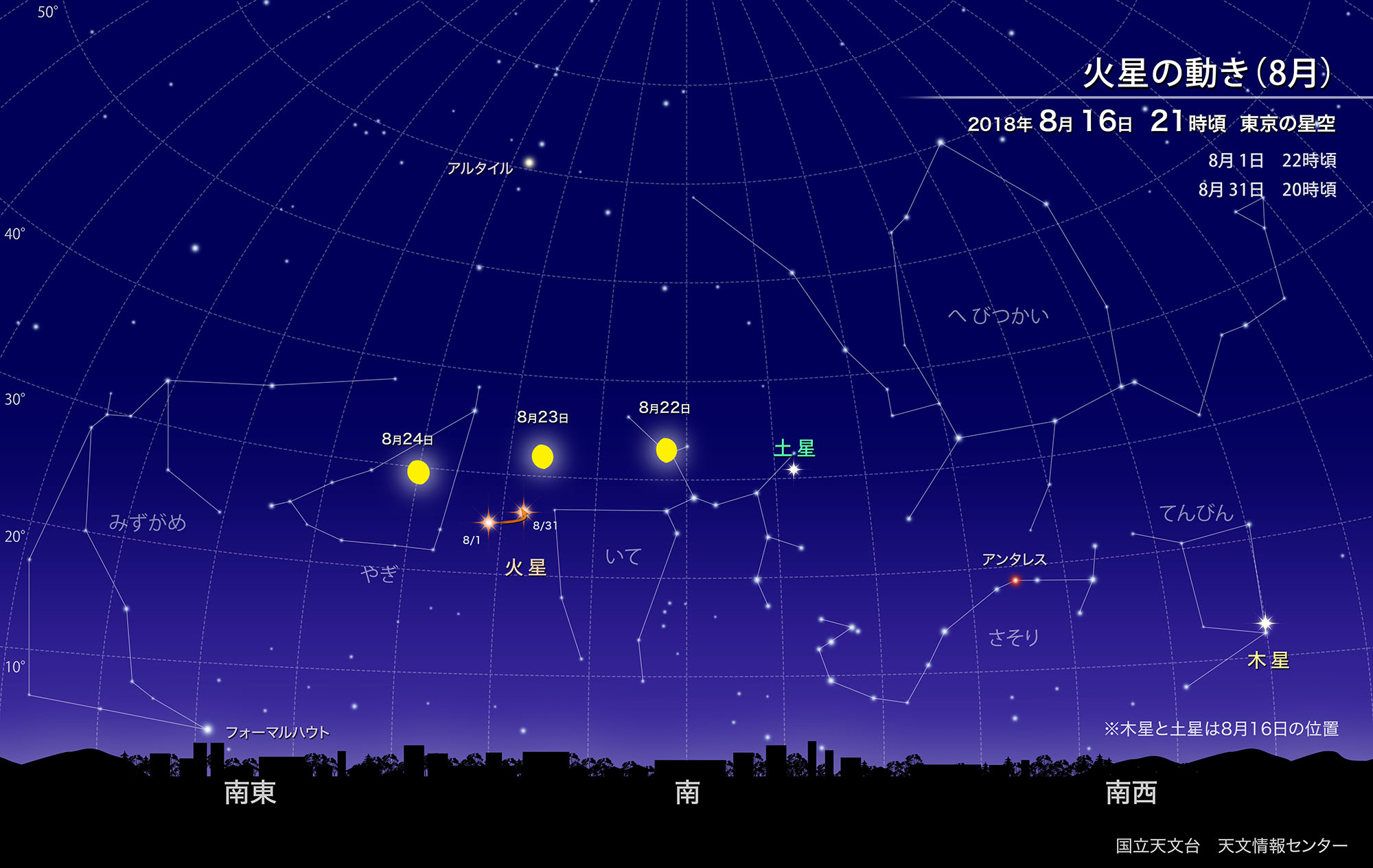 「火星の大接近」というと、その瞬間の日時ばかりが注目されがちです。しかし上の図のように、最接近前後の数週間は、地球と火星はほとんど同じ方向に並んで公転しているため、接近した状態が続きます。今回、火星は6月下旬から9月上旬頃までマイナス2等を超える明るさで輝いています。また、最接近の頃よりも遅い時期の方が、火星が昇ってくる時刻が早くなり、宵の空で観察しやすくなります。つまり、最接近のときだけでなく、2018年の夏から秋にかけての比較的長期間、視直径が大きくて明るく輝く火星を夜空で楽しむことができるのです。21時頃、南の空を眺めてみませんか。